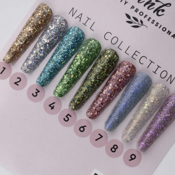 Číslo 9 – poloprůhledný růžový gel s multiholografickým a světélkujícím jemným gliterem, a také s kousky růžového potálu. Série gelů Space – série gelů pro glamurové, lesklé francouzské manikúry nebo působivé prodlužování. Gely obsahují brokátový lesk. Díky vysokému obsahu třpytek jsou gely husté a super pevné. Jsou vhodné jak pro modelování, tak pro posílení nehtů.